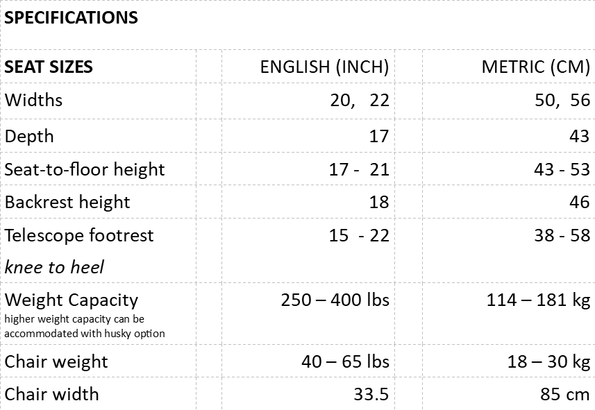 Beach Wheelchair Sizing and weight specifications
