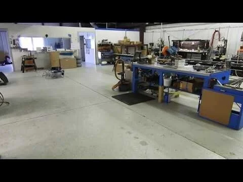 This is a view panning from the back of the shop towards the front. The first thing you see is the welding station. As you can tell there are many parts that are ready to be welded. and fabricated into beach wheelchair frames. From there the camera takes you to the front of the shop, then over to the far wall. On the far wall, you can see the milling machines, lathe and bender, In the middle is the cold saw and assembly table